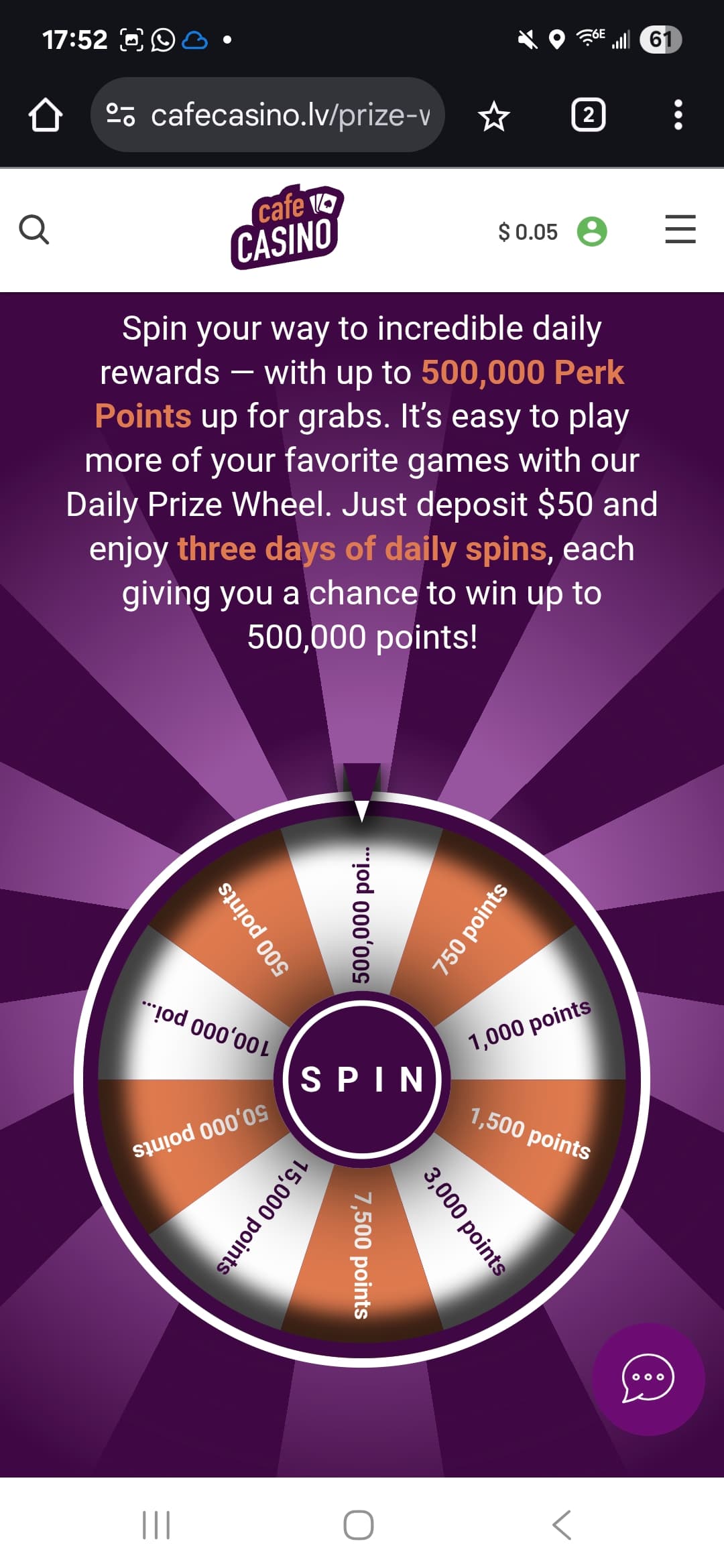 Need help with my daily prize wheel. I deposited the 30 or more and they told menit had to be 50 dollars now that they changed the promo. I sent the CS rep a screenshot showing my home page with promotional bonus wheel and when i deposited my money with crypto and he still told me he couldnt help me at all. My bf has cafe casino as well and he deposited the 30 the same night as me and got his wheel spins with no problem.
